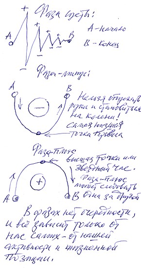 Фазы жизниПосмотрел на свои фазы. Вот кому я всем обязан ... Жил в наивном весь в цвету. Встретил в жизни суету. Где подпрыгнешь, побежишь, Где от холода дрожишь. Все толкаются, спешат, Чтоб друг другу помешать. Так без толка суетился. Вдруг слегка я оступился. Сам себя я наказал - В минус-фазу сам попал. Ухнул вниз, где много хуже, Чем в суете, когда сам кружишь. Здесь проблемы жгут и жмут. И из них на шее жгут, Жизнь с изнанки узнаёшь И своё лишь отдаёшь. Вокруг сплетни, ситуации. Выбраться надо стараться. Без ступенек в крутизну Ввысь спешишь как в новизну. Всё! За край уже схватился, Своего уже добился - Глубокий минус позади, А что будет впереди? Силы есть, полно экстаза. Вот она - твоя плюс-фаза: Дважды два всегда четыре, В яблочко стреляешь в тире. Свой снимаешь урожай, Хотя заботы через край. Здесь доход и достижения Без особого сражения. Оживилось твоё "Я" - Нет врагов, кругом друзья. Но не теряешь концентрации, Чтобы делать дело с грацией. Посмотрел на свои фазы. Сам себе я всем обязан! 4.06.2014 |