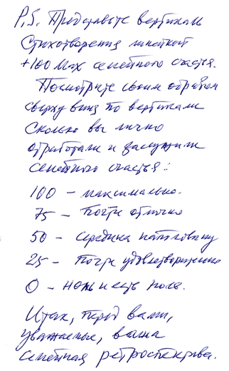 Жена и мужСначала всё игрушечки - Устройство бытия. Тарелочки и кружечки, Квартира вся своя. Работа даёт денежки, Чтоб вместе отдыхать. Друг без друга уж не денешься - В этом семьи стать. Быт украшают дети. Где в радость — счастье в дом. И нет иных запретов Как здравый смысл с умом. Дети подрастают. Их надо воспитать. Родители сгорают, Чтобы своё отдать. Но дети разлетелись. У всех свои дела. Внуков захотелось. Такова Судьба. И внуки даже ближе По сердцу и душе. Успех детей престижен. Семьи это сюжет. Время заставляет Для внуков делать всё. Впрочем, кто как знает … Любовь только растёт. 10-03-2017 |